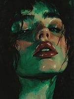 Dit schilderij is een expressief portret dat wordt gekenmerkt door een sterk gebruik van gedurfde, contrasterende kleuren en grove penseelstreken. Het gezicht van het afgebeelde personage is gedomineerd door levendige groen tinten, die sterk afsteken tegen de donkere achtergrond en schaduwen. De ogen en verleidelijke lippen van het…