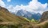 prachtig alpenlandschap en wandelbestemming Bindelweg, Viel del Pan, Zuid-Tirol, Dolomieten. wandelroute van Pordoijoch naar het Fedaia-meer
