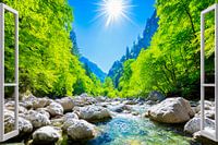 fotorealistich digitaal beeld van uitzicht vanuit het huis op een mooi landschap of tuin met fijne details en heldere kleuren