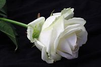 een witte roos tegen een zwarte achtergrond.