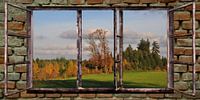 Venster beeld, herfst, de herfst beeld, herfst bos, raam uitzicht, bomen, boom, eiken, beuken, berken, naaldboom, gemengd bos, herfst kleuren, de herfst, wolken, atmosfeer, baksteen, bakstenen muur, oude ramen,