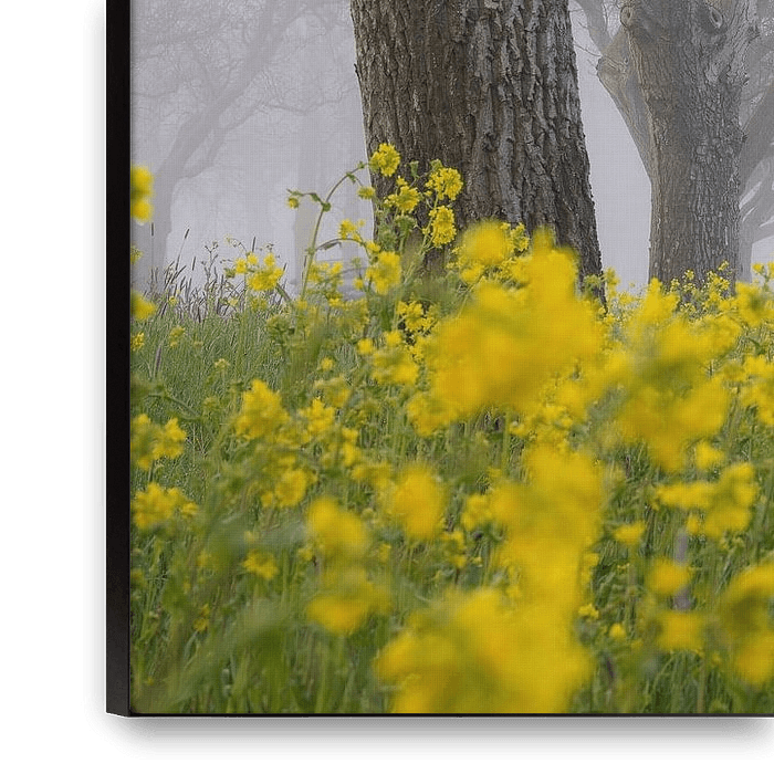 landschap in Homoet, Gelderland, met zicht op een slootje, en een rij bomen met raapzaad ertussen, dat alles in een dikke mist
