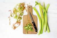 rabarberstelen en spiralen van de rabarberhuid, gesneden stukken en een keukenmes op een snijplank, wit geschilderde houten achtergrond, uitzicht van bovenaf