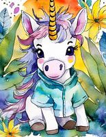 De afbeelding gemaakt doormiddel van Ai toont een prachtig tafereel van een kleurrijk jong eenhoornveulen, gevangen in levendige tinten die doen denken aan een zachte waterverftechniek. Het eenhoornveulen straalt jeugdige energie uit en heeft een lieflijke uitstraling die perfect past bij een kinderkamer.