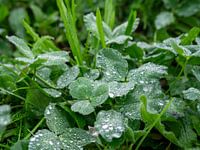 waterdruppels gevangen in het zonlicht op een bedje van groen