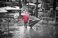 Een regenachtige dag in Thailand in de buurt van de river Kwai. Er kwam zoveel regen naar beneden, dat binnen mum van tijd de straat blank stond. Ik heb dit beeld geschoten, wat ik zelf heel krachtig vindt. Een man die de moed op goed weer opgegeven heeft en de parasol van zijn verkoop kraampje aan het opruimen is. Door alle kleur…