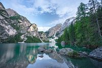 Mooie reflecties van het landschap in dit prachtige meer. Lago di Braies in Italië. omgeven door de bergen.