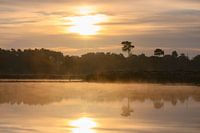 landschap op de Hatertse en Overasseltse vennen, waar de zonsopkomst reflecteert over het water van de vennen, waar de nevel over hangt