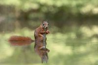 Het eekhoorntje pakte een nootje uit het water en ging deze snel op zitten eten. Door het rustige water is er een mooie weerspiegeling met een mooie rustige achtergrond te zien.