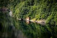 een kleine Loge reflecteert zich in de stilte water in Noorwegen.