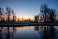 bomen reflecteren in een pond water op de wassenaarse golfclub Rozenstein met ochtendlicht in het achtergrond.