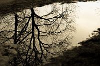 tijdens boswandeling mooie weerspiegeling van boom in het water van een modderplas