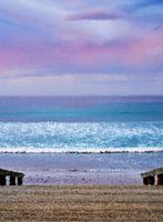 Landschap met een regenachtige zonsopgang over het strand en de zee mixed media