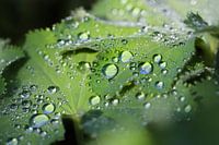 vroege ochtend na regenbui druppels op een groen blad van de vrouwenmantel