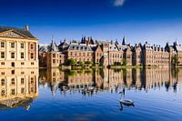 regeringsgebouwen, het Torentje van de minister-president en het Mauritshuis aan de Hofvijver in Den Haag