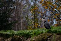 reiger wachtend op zijn kans met een prachtig decor als achtergrond.