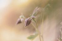 close up van de bloemknoppen van een paarse akelei, met een beige retro bewerking