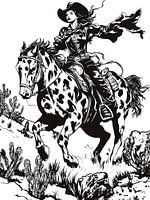 Dit zwart-witte cartoonkunstwerk toont een jonge cowgirl in actie, galopperend op een gestippeld paard door een woestijnlandschap vol cactussen. De stijl is een speelse mix van pop art en striptekening, met gedurfde lijnen en contrasterende patronen die het geheel een dynamische uitstraling geven. De cowgirl draagt een strikblouse die…