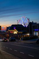 Avond sfeer in Noordwijk aan Zee net na zon is ondergegan. Op een zaterdag avond de kruggen en de nieuwe reuzenrad zijn druk bezig. Mensen genieten van de goede, bijna zommerse weer.