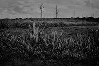 magisch zwart wit beeld van rij grillig gevormde agaves.