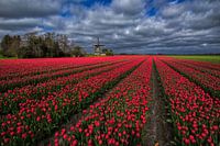 Koop de foto rijen rode tulpen met molen van peterheinspictures op canvas, aluminium dibond, (ingelijste) fotoprint, behang en ArtFrame, op maat geprint in Fine-Art kwaliteit.