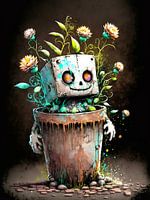 Een schattige, humoristische robot met een verweerd metalen oppervlak groeit als een plant uit een oude, roestige bloempot. Levendige bladeren en heldere bloemen ontspruiten uit zijn hoofd en geven hem een bijna magisch leven. De combinatie van natuur en machine werkt als een poëtisch symbool van wedergeboorte en hoop.