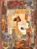 Collage van gelli prints met stempels en sjablonen, afbeeldingen en gouddraad.