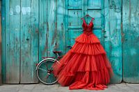 rode jurk met fiets en blauwe achtergrond kunstmatige intelligentie met photoshop