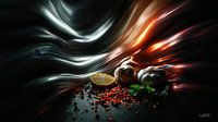Centraal in de afbeelding zie je vurige rode pepers, robuuste tenen knoflook en frisse partjes limoen – producten die symbool staan voor intensiteit, versheid en karakter.
