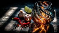 Centraal in de afbeelding zie je vurige rode pepers, robuuste tenen knoflook en frisse partjes limoen – producten die symbool staan voor intensiteit, versheid en karakter.