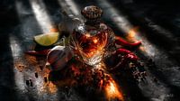 Centraal in de afbeelding zie je vurige rode pepers, robuuste tenen knoflook en frisse partjes limoen – producten die symbool staan voor intensiteit, versheid en karakter.