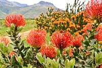 Landschap met rode protea's en bergen op de achtergrond