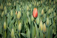 Een groot Hollands bloembollenveld in de lente met allemaal rode tulpen in knop.