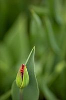 tulpenfoto voornamelijk in het groen, alleen de bloemblaadjes tonen rode puntjes