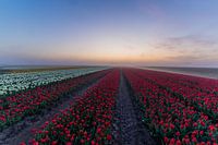 Op 11 april 2025 waren de verwachtingen voor mist goed. Het was een koude nacht geweest en het zou mooi weer worden. Dit veld aan de koningspade in Aartswoud bestaat uit vele soorten en kleuren tulpen. Dat maakt het interessant om te fotograferen. Ook omdat de kerk van Aartswoud in de achtergrond kan worden meegenomen.