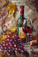 olieverf afbeelding van een fles rode wijn en een glas met ingeschonken rode wijn naar een tros blauwe druiven