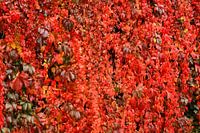 Rode wijnbladeren, die het formaat vullen. Scherpteverloop van links naar rechts. Wazig aan de rechterkant.