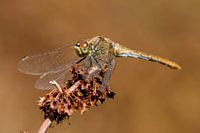 Een rombout heeft een uitgedroogde zuringstengel uitgekozen om een zonnebad te nemen. De vleugels neergelaten, de ogen alert. Even genieten.