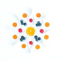 Op de witte schaaltjes ligt blauwe bessen en framboos.