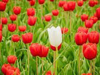 een rood tulpenveld met een witte tulp in het midden van het veld.