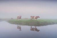 roodbonte koeien staan aan het water op een mistige ochtend in de Eempolder