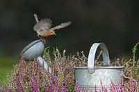roodborst staat klaar om weg te vliegen vanaf de gieter