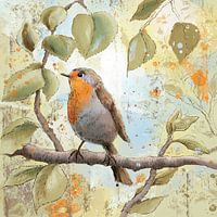Op deze tekening is een roodborstje te zien die parmantig op een tak zit. Het roodborstje is getekend met pen op papier en vervolgens met digitale tekentechnieken ingekleurd. Deze bijzondere werkwijze geeft een unieke stijl aan dit kleurrijke kunstwerk.