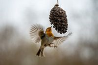 Roodborstje hangt stil in de lucht om de pindakaas uit de dennnenappel te eten. Hij fladdert heel snel met zijn vleugels, maar door de korte sluitertijd zijn de veertjes zichtbaar.