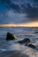 rotsen in de Noordzee met een dreigend wolkenlucht en de industrie in de Europoort op de achtergrond