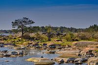 rotsige kust baltic zee met een blauwe lucht en bomen en struiken