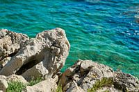 rotsachtige kustlijn langs de Adriatische Zee met heldergroen water nabij de stad Krk op het gelijknamige eiland, Krk, Kroatië