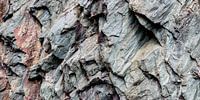 Panorama foto van ruige rotswand aan de kant van een weg in de bergen. In het ruwe gesteente zitten allerlei kleuren. Ook zijn verschillende lagen te onderscheiden.