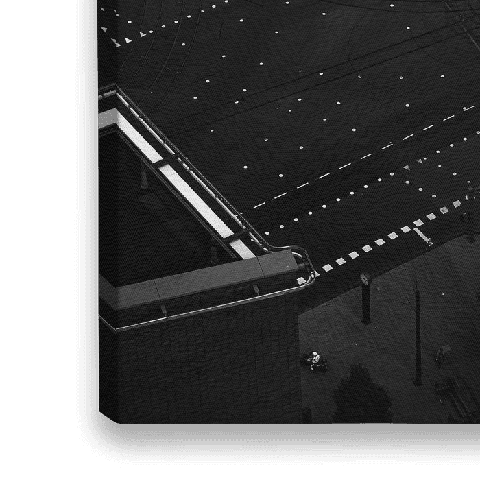 Een kruispunt in Rotterdam, gezien van bovenaf. Door het hoge contrast in zwart wit wordt het abstracte kunst. Als een soort voyeur kijkt dit beeld neer op het kruispunt, waar niemand lijkt te durven oversteken.