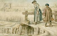 rouw en jongen op een brug bij het ijs, Hendrick Avercamp, 1595 - 1634